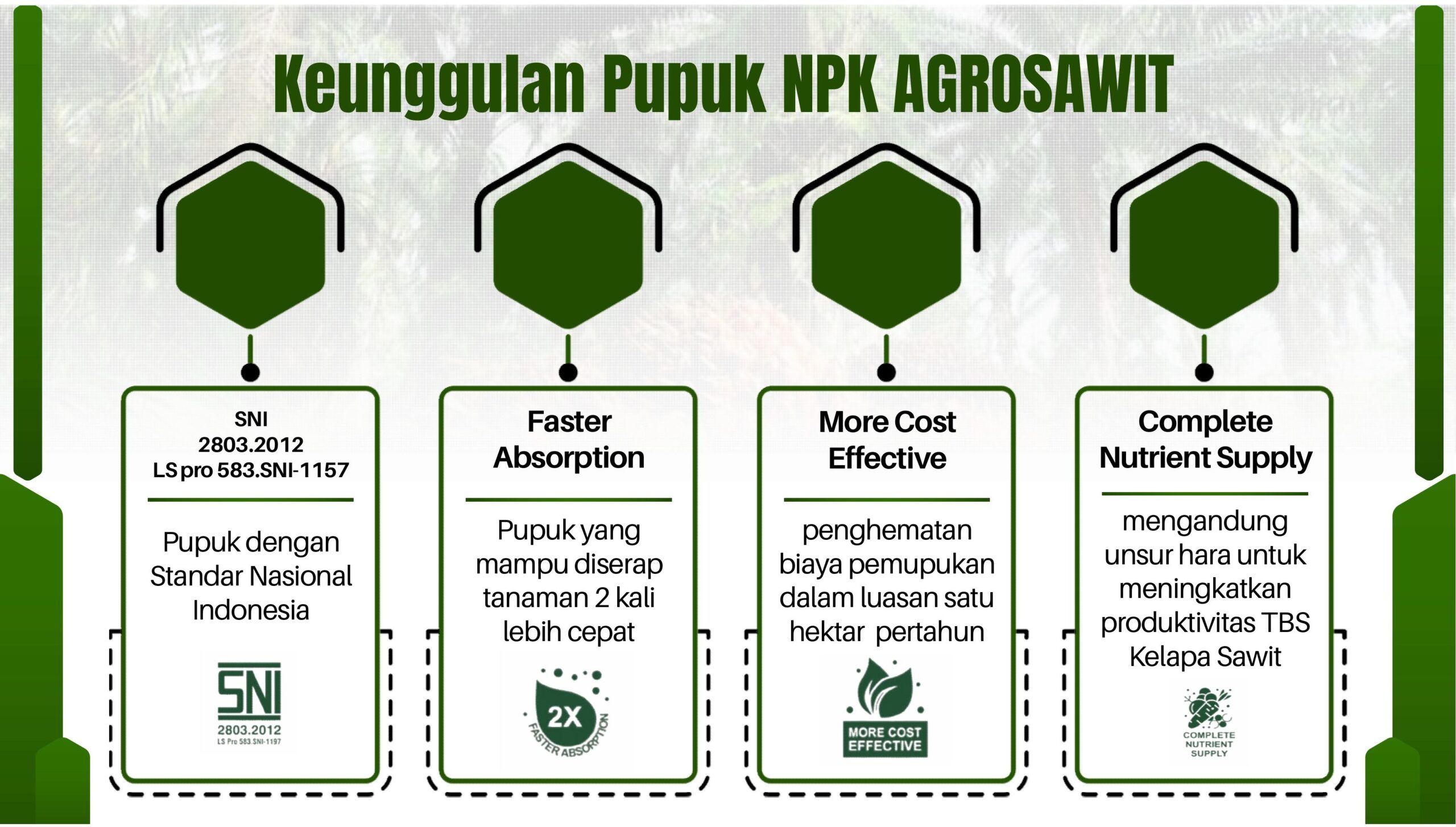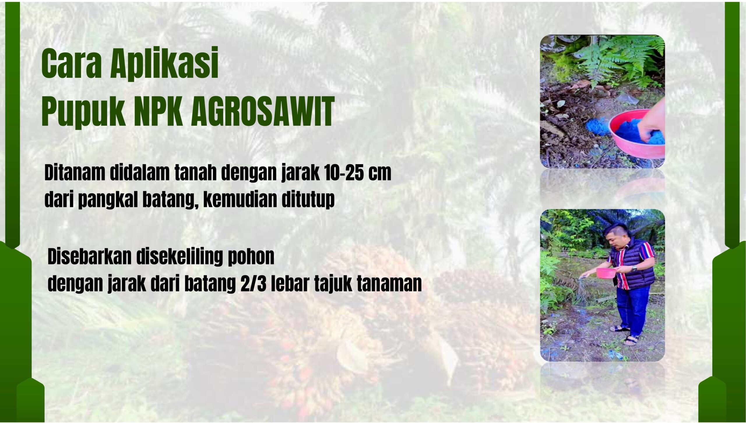 AGROSAWIT adalah pupuk Premium Water Soluble Fertilizer yang mudah larut diserap tanaman dan diperkaya dengan kandungan yang dibutuhkan tanaman kelapa sawit, sehingga mampu meningkatkan fungsi akar, batang dan daun untuk fase vegetatif dan generatif serta mengandung zat pengatur tumbuh (ZPT) dan pembenah tanah sehingga mampu meningkatkan produktivitas TBS kelapa sawit.